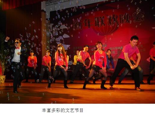 晚上,舉行了盛大的新年聯(lián)歡晚會(huì)。省畜牧業(yè)協(xié)會(huì)會(huì)長(zhǎng)刁運(yùn)華熱情洋溢的新年賀詞使大家精神振奮,成都電視臺(tái)主持人張睿攜成都市藝術(shù)劇院和成都市交響樂(lè)團(tuán)的演員高雅、激情的節(jié)目博得大家陣陣掌聲,畜科公司員工們表演的詩(shī)朗誦《意氣風(fēng)發(fā)的畜科人》和舞蹈《畜科style》,展示了畜牧人的文藝才能和精神風(fēng)貌,將晚會(huì)推向了高潮。