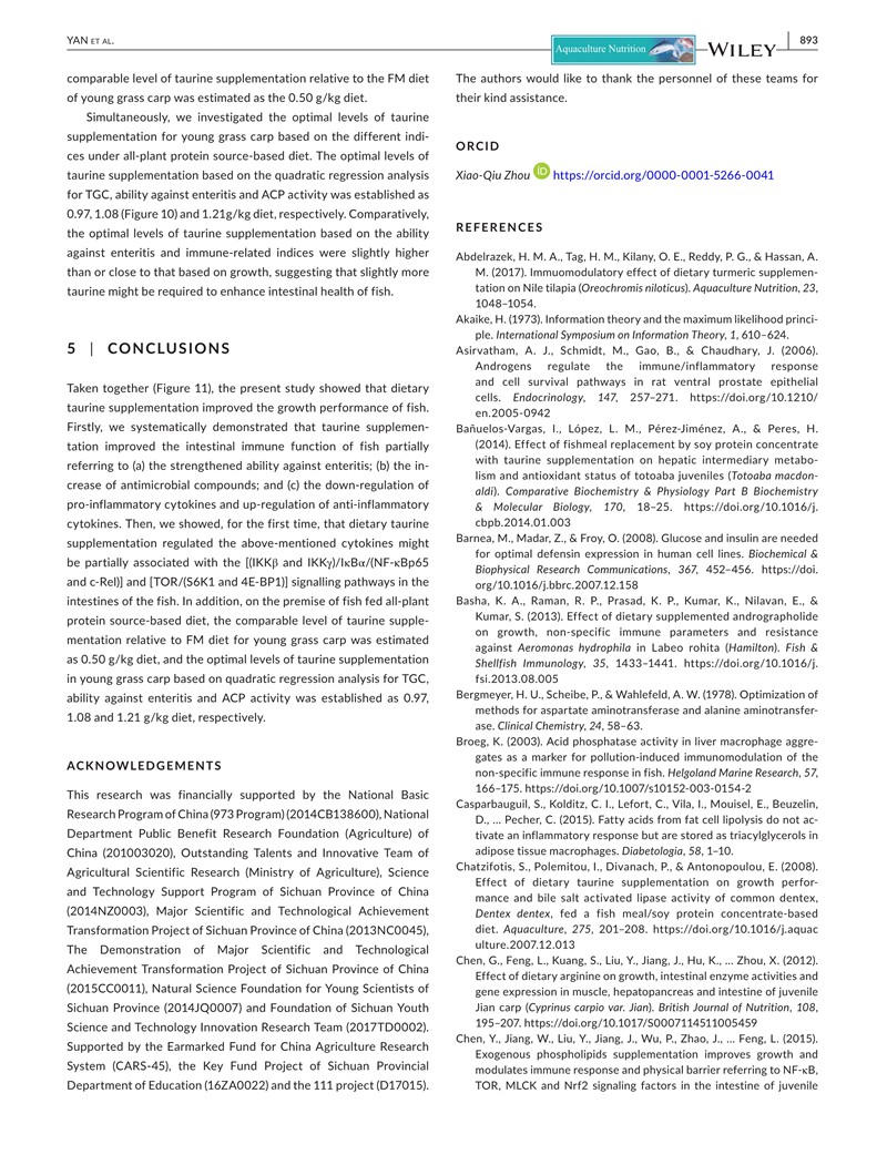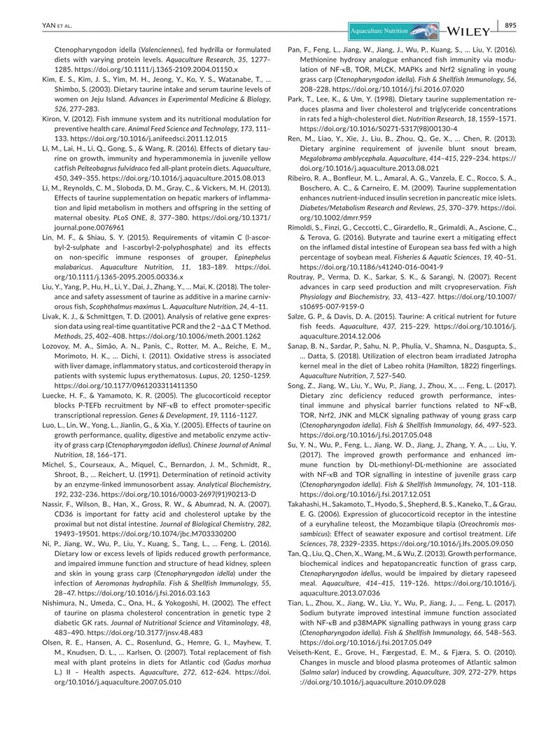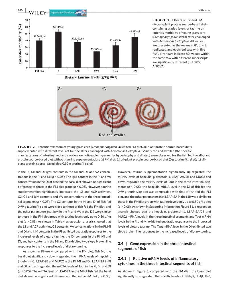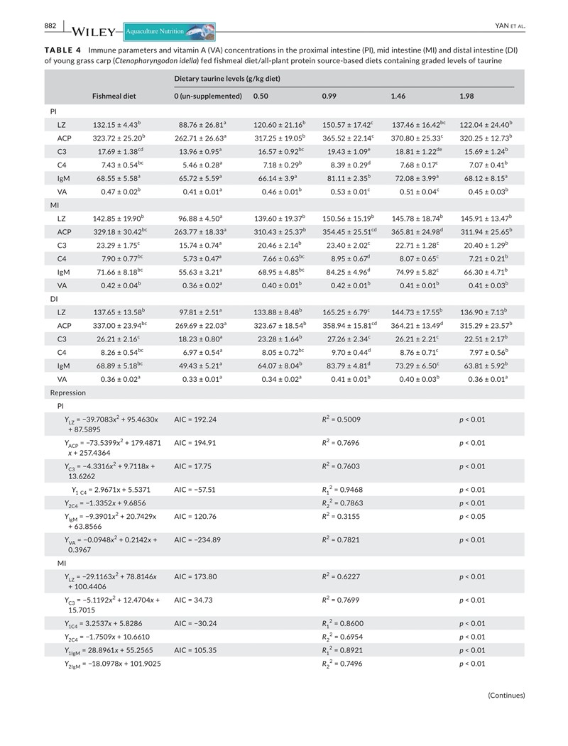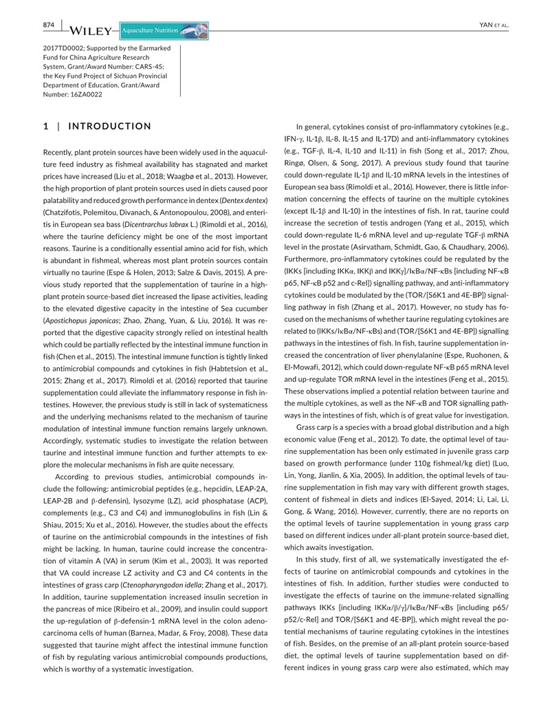 Dietary taurine supplementation to a plant protein source‐based diet improved the growth and intestinal immune function of young grass carp (Ctenopharyngodon idella)