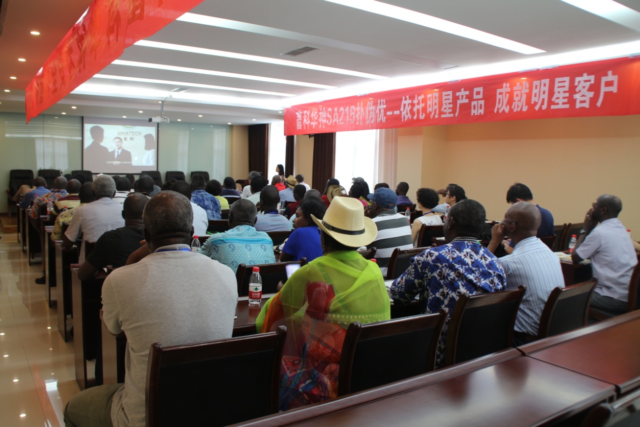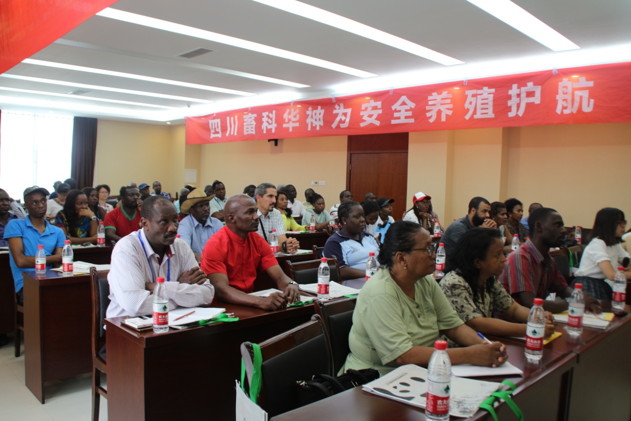 此次考察由農(nóng)業(yè)部對(duì)外經(jīng)濟(jì)合作中心項(xiàng)目章樹民處長(zhǎng)帶隊(duì),四川省農(nóng)業(yè)廳國(guó)際合作處高級(jí)農(nóng)藝師陳紅群陪同考察。研修班50名學(xué)員來自南非、塞拉利昂、阿爾及利亞、貝寧、剛果等14個(gè)國(guó)家,先后參觀了我公司廠區(qū)和研發(fā)中心,畜科華神常務(wù)副總陰文奇、副總經(jīng)理李慧明進(jìn)行了全程講解。